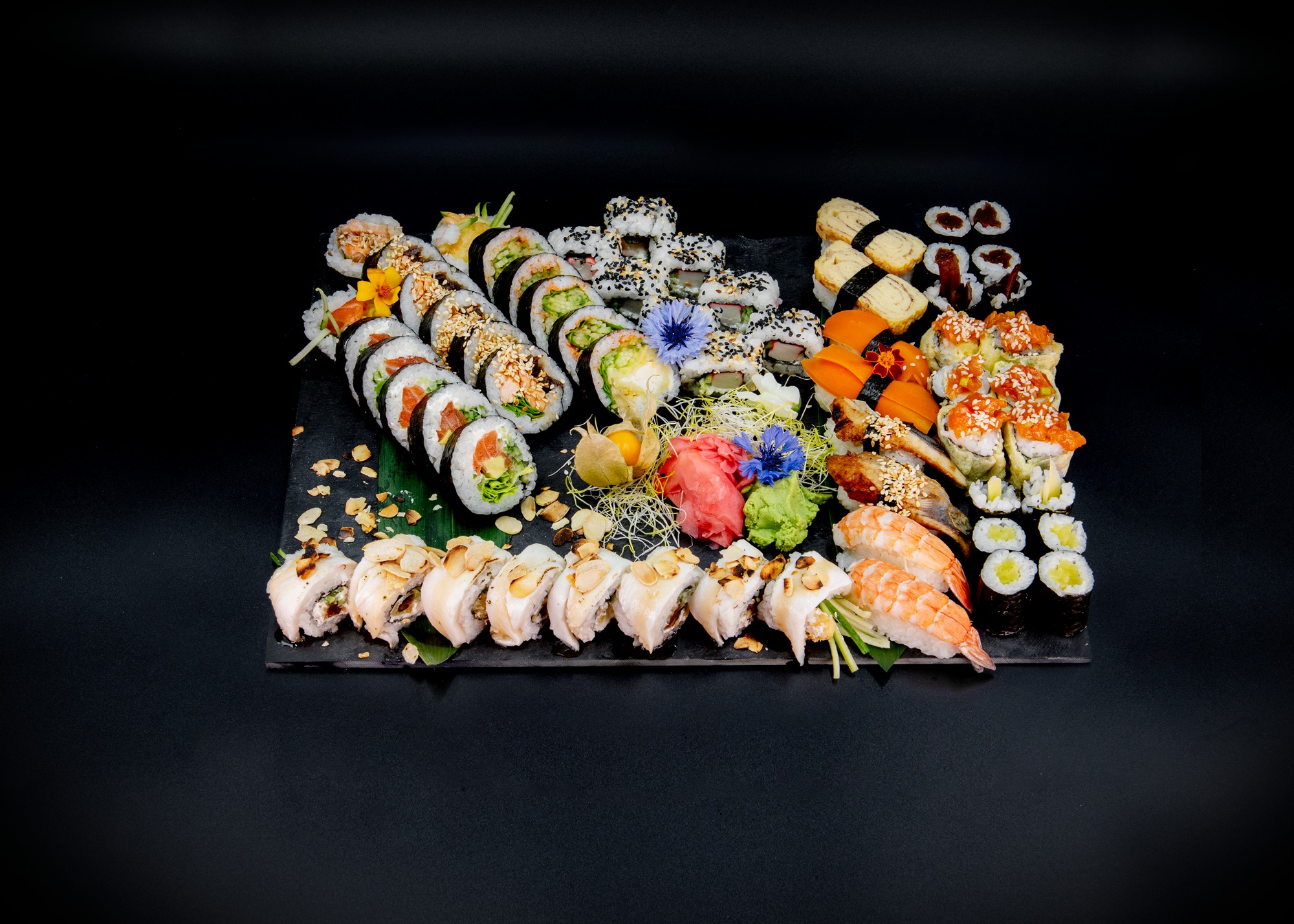 6x Futomaki Golden Blossom – pieczony łosoś z sosem kabayaki, gruszką, zieloną cebulką, tempura // TOP: płatki migdałowe, sos chutney