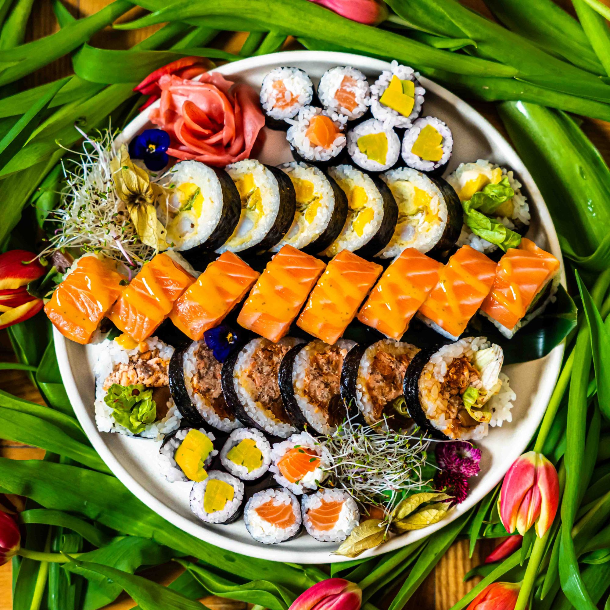 8x Uramaki Rainbow Roll – grzyby shiitake, ogórek, serek // TOP: łosoś, tuńczyk, awokado, sos kabayaki, sezam