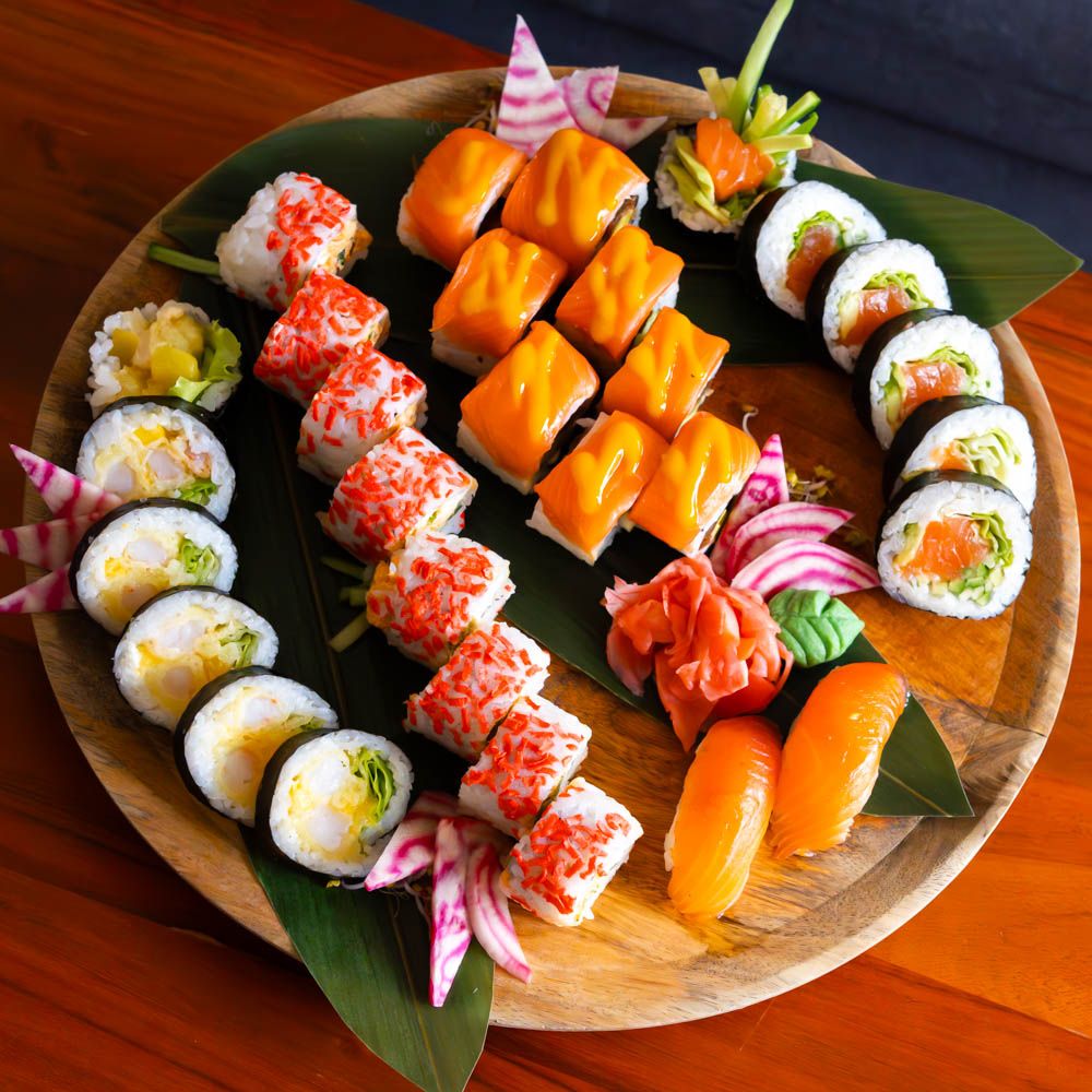 * Zestaw Promocyjny - Tylko we wtorki * 12 x hosomaki z pieczonym łososiem z sezamem i sosem śliwkowym 12 x hosomaki z tamago, sosem teriyaki i migdałami 12 x hosomaki z surowym łososiem 12 x hosomaki z ogórkiem i prażonym sezamem 6 x hosomaki z marynowaną rzodkwią 6 x hosomaki z marynowaną tykwą